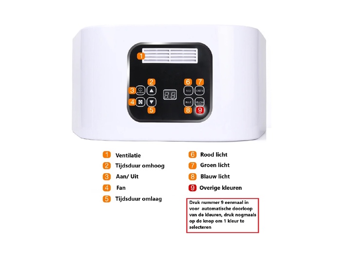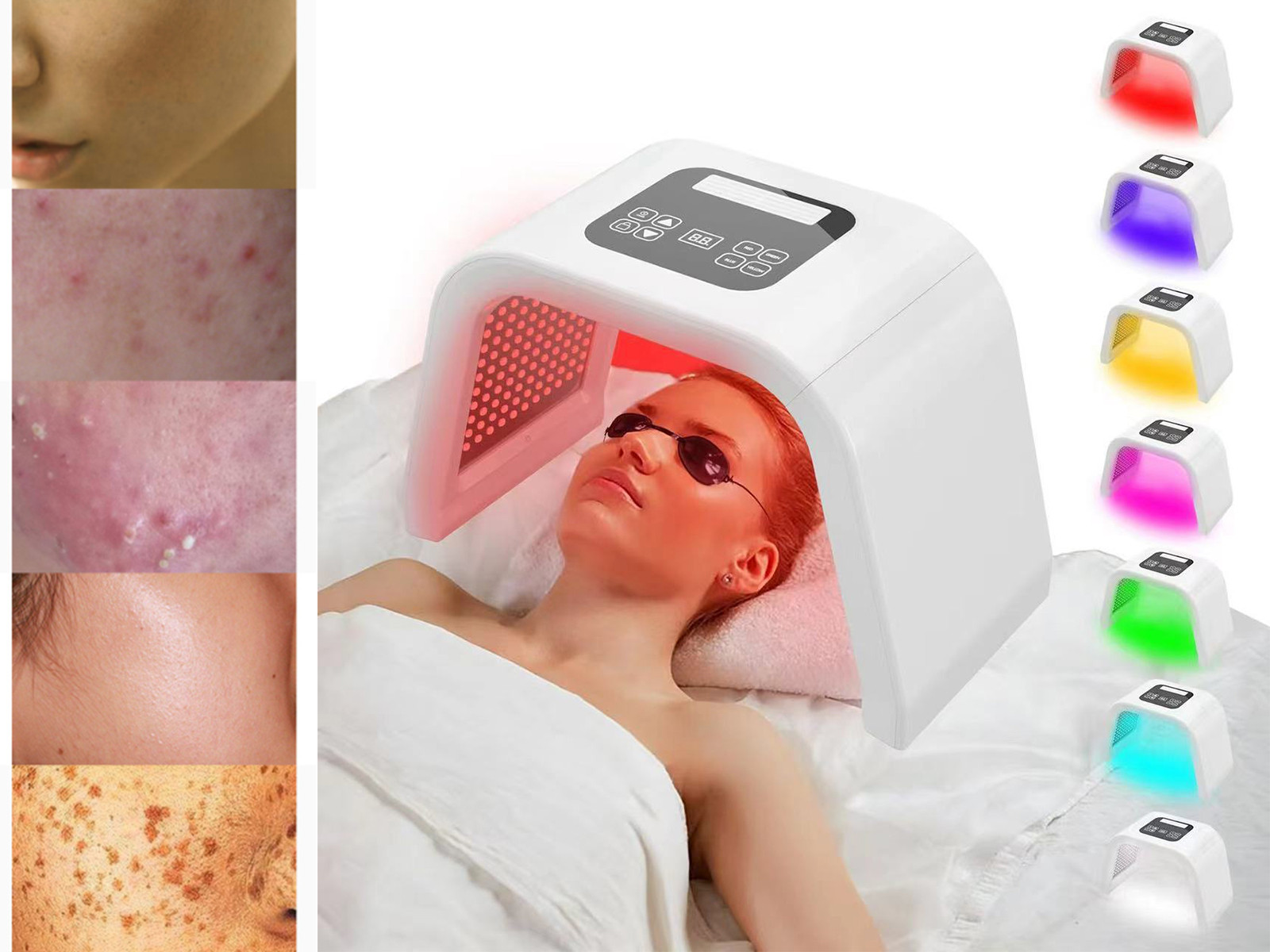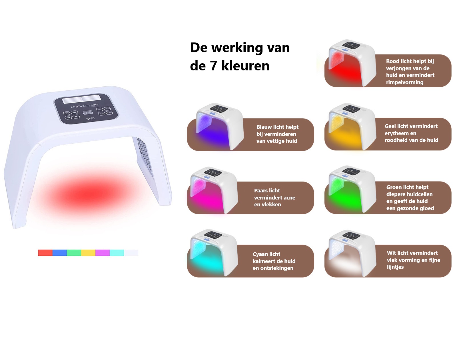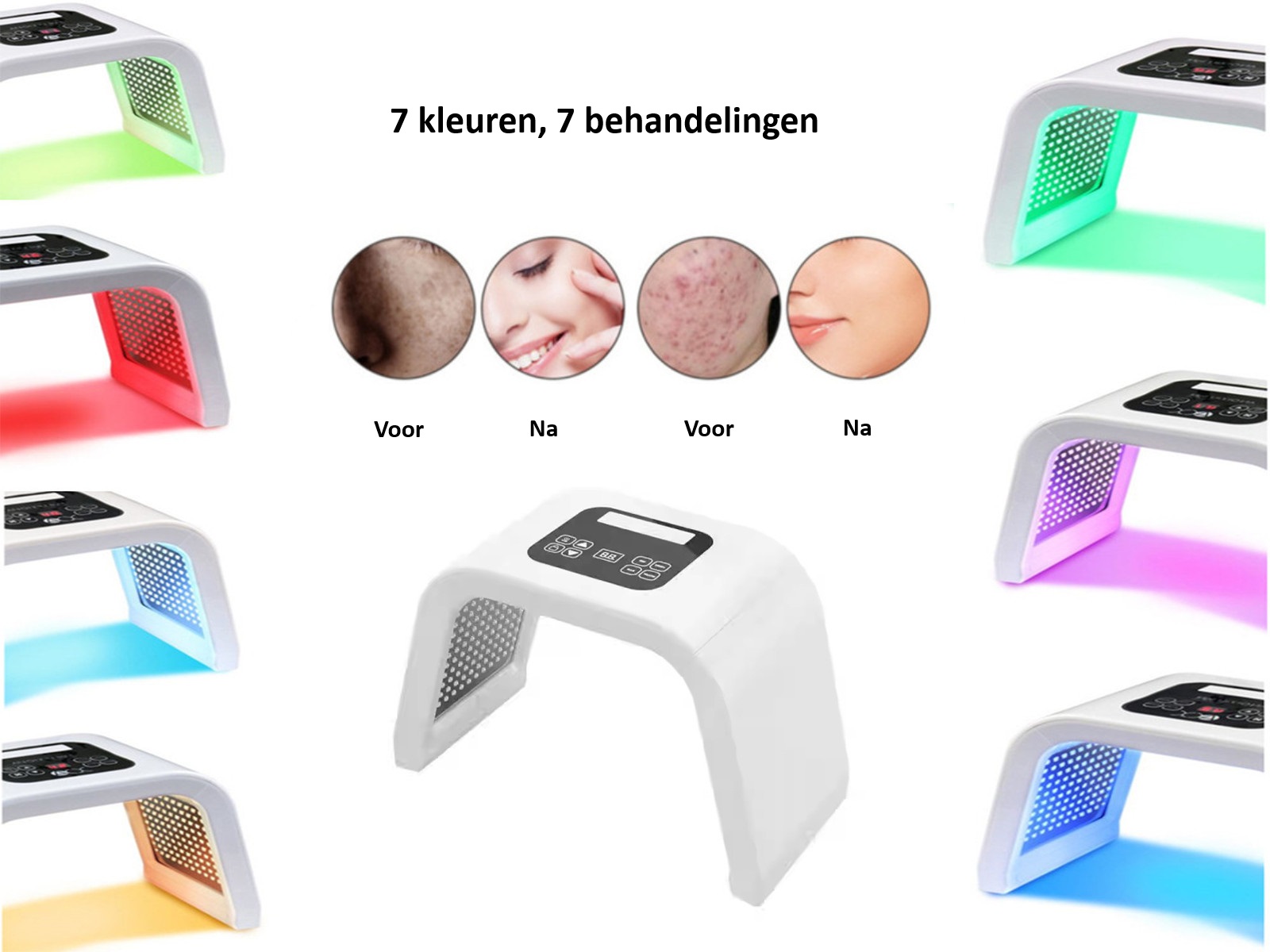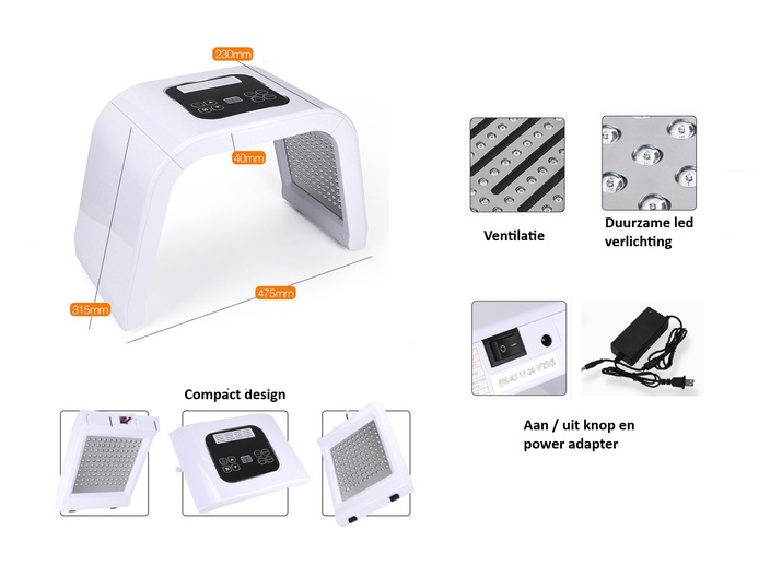 Dit apparaat combineert 7 kleuren led-licht met verschillende doeleinden; zo wordt de aanmaak van collageen gestimuleerd, de elasticiteit van de huid verbeterd, huidveroudering (fijne lijntjes) verminderd, acnehuid verbeterd, poriën verkleind, pigmentatie verminderd en heeft het als overall resultaat dat uw huid wordt verjongd en gezonder oogt.