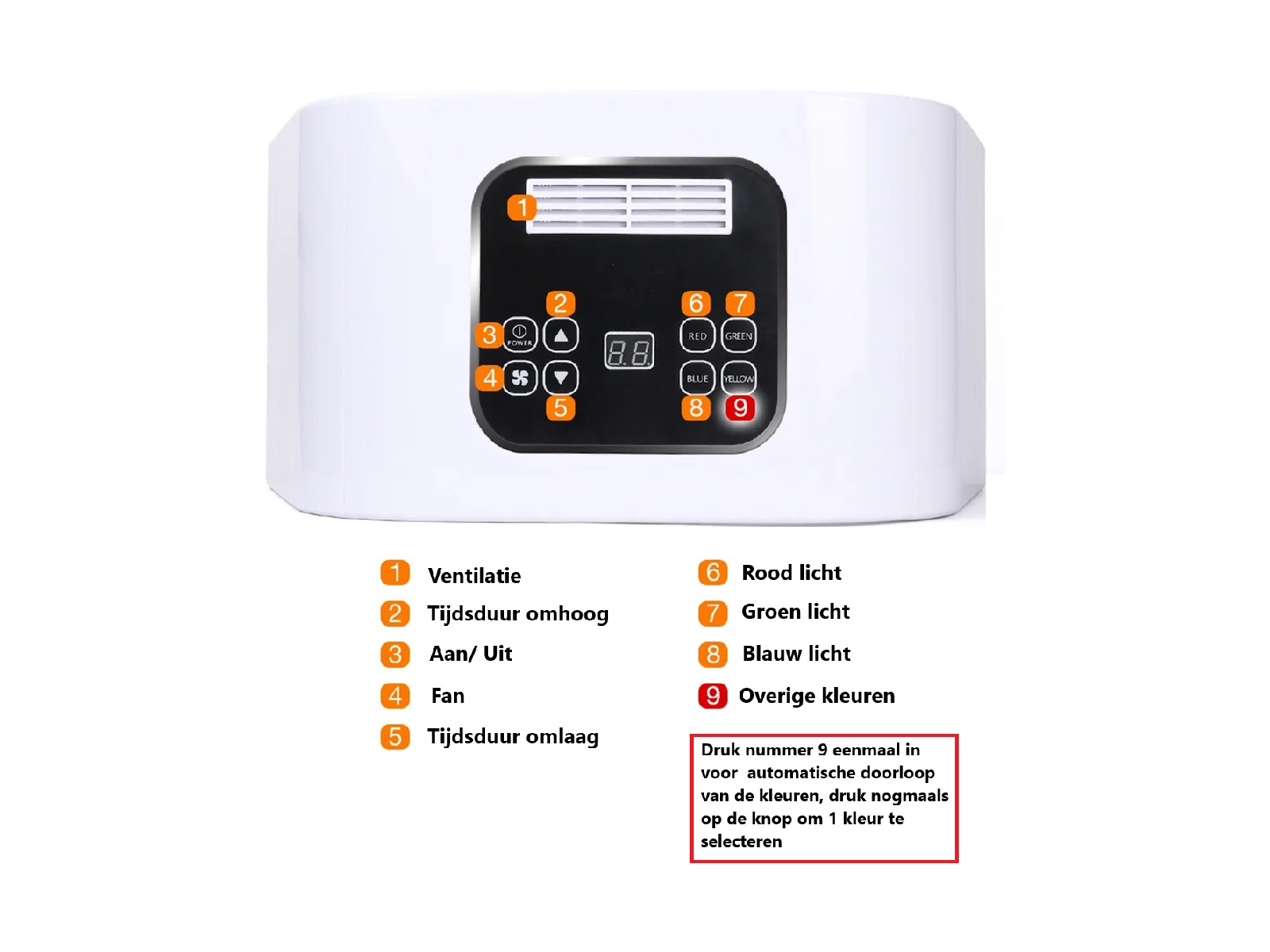 Opmerking: houd de "GELE" knop 3-5 seconden ingedrukt om de andere drie kleuren in te stellen.